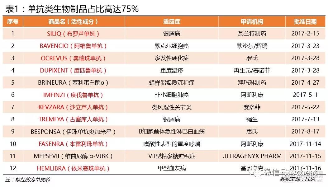 单抗类新药数量最多:从2017年FDA批准的生物制品名单看,单抗类药物有9个,占比高达75%。