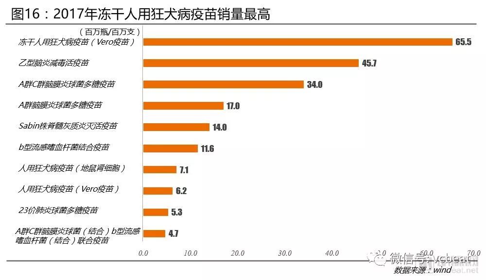 狂犬类和脑膜炎类疫苗占据主导:2017年国内销量最高的疫苗是冻干人用狂犬病疫苗(Vero疫苗),达到655万支,占整个疫苗销售量的23.47%。