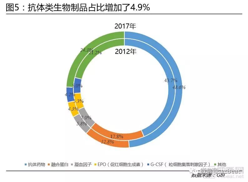 抗体药物一枝独秀:从生物制品用药看,只有抗体药物出现了增长,增加了4.9个百分点,其余用药都出现了不同程度的下降。主要是因为肿瘤成为抗体用药的主要领域。