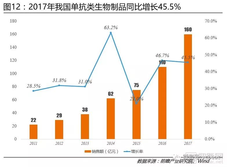 从市场规模看,血液制品高于单抗类生物制品;但从销售增速看,单抗类生物制品增速远远超过血液制品。可见,未来单抗类生物制品市场前景广阔。