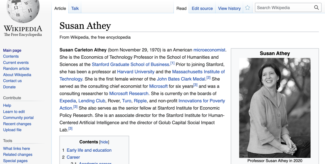 2020年11月,我便通过这样一则招人广告,经过面试、测验,申进了 Stanford 商学院的 Social Impact Lab,之后直到研一结束(2021年6月),我在这里作为 RA(research assistant),做一个推荐系统方面的科研项目。Lab 的导师 Susan Athey 是经济学出身,美国科学院院士,24岁就博士毕业,维基百科上她的词条有13种语言,非常厉害。