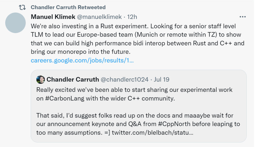 在 7 月 15 日至 21 日举行的多伦多北部 C++ 开发者大会(The Northern C++ Conference)上,谷歌工程师 Chandler Carruth 宣布了名为“Carbon”的全新开源开发语言,并称它将是 C++ 的继任者。