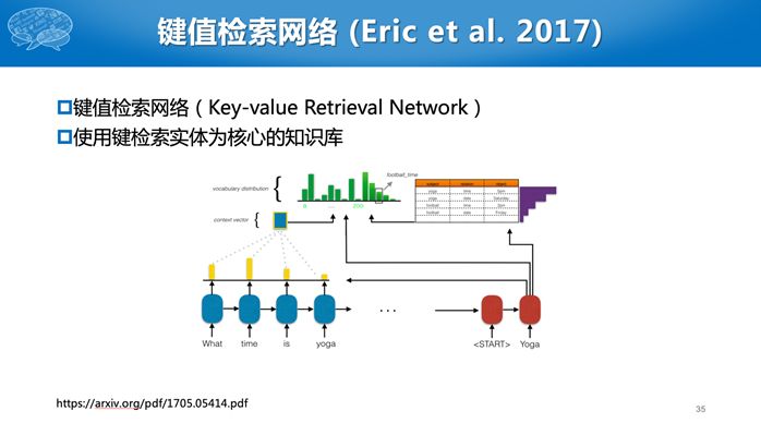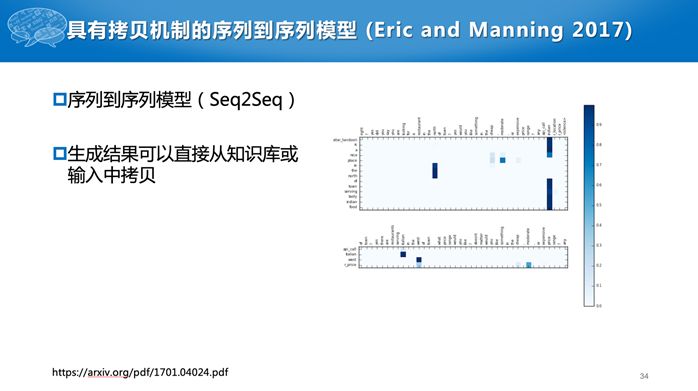 Eric and Manning (2017)直接使用序列到序列的模型,从用户的提问生成相应的回复。针对任务型对话,传统的序列到序列模型有一个明显的问题,就是我们不能简单地从历史对话数据中学习,比如问“明天天气怎么样?”如果训练数据有回复说“晴天”,但是不能每次都一样的回答,需要根据当前天气预报数据进行回复。所以在他们的工作中,生成的词有两个来源,一个数据库,如“晴天”或者“阴天”,第二就是从原始文本中拷贝过来。
