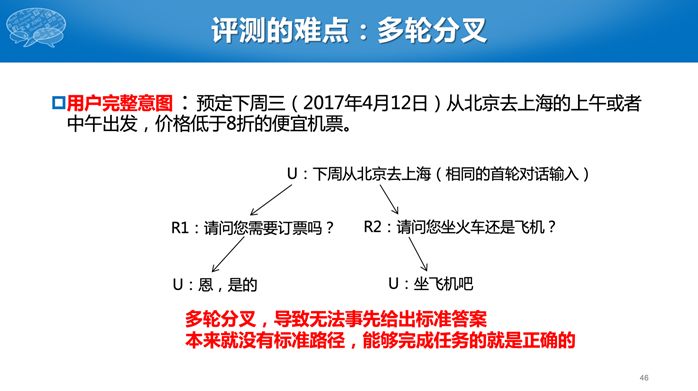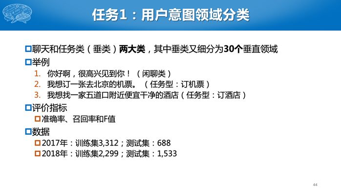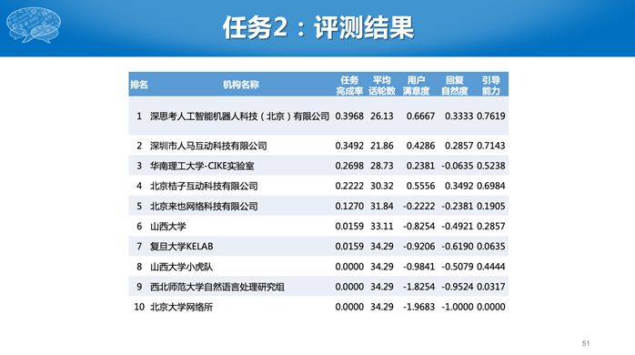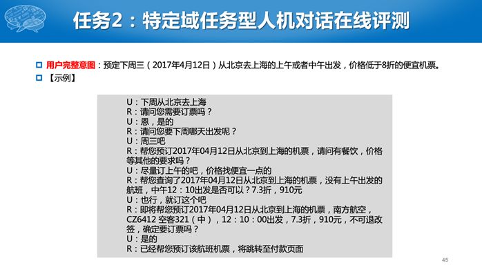 第二个任务比较难,参赛单位需要构建一个完整的对话系统,对于同一个用户输入,有很多种可能的输出,到底哪个输出好,现在机器比较难评价。因此我们采用了人工评测的办法。有一个真实的评测人员,给所有的系统统一的初始输入,然后针对每个系统的回复继续进行对话,若干轮后给出评价。评价有几个指标,包括用户满意度、回复自然度等主观指标,还有对话轮次等客观指标,对话轮数是越少越好。
