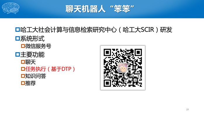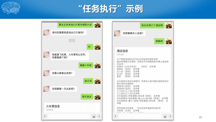 我们实验室开发了一个叫“笨笨”的对话机器人,主要包括聊天、任务执行、知识问答和推荐四项功能,并通过微信提供服务。其中任务执行就是DTP系统提供的。我们可以用“笨笨”完成订火车票、飞机票,以及查询酒店信息等出行场景下的功能。