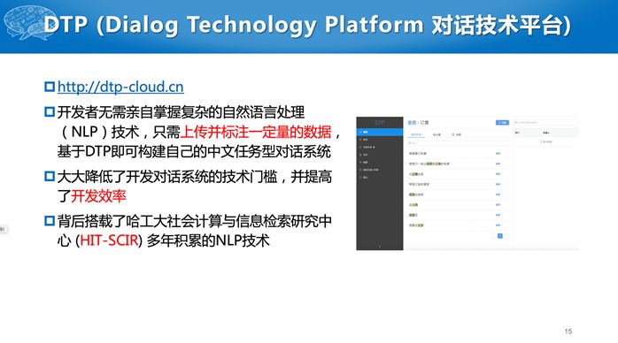 我们的对话技术平台(DTP)也是这样的网站,网址是:http://dtp-cloud.cn,开发者若想做一个对话系统,不需要亲自实现刚才介绍的三个模块,只要上传数据并进行标注,最后就可以提供对话API,来回答用户的问题或者进行对话。背后是我们积累多年的自然语言处理技术。