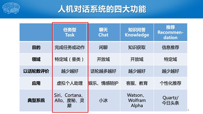 我们将对话系统分成四个主要的功能:第一个是任务型对话系统,也可以认为其他都是非任务型对话系统,又可以进一步划分为聊天类、知识问答类,以及推荐类,这几个类型的机器人我们研究中心都在做。我今天主要介绍任务型的对话系统。