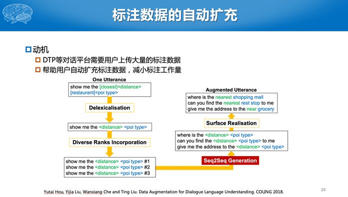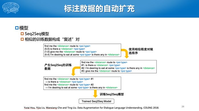 在使用对话技术平台时,目前一个最大的问题就是用户需要上传一些数据,但是数据量往往非常少,如何在少量数据的情况下提高对话能力呢?假设用户就上传三句话,并为这三句话标注了一些槽,我们希望能通过这三句话改写成更多语义相同,但是表达形式不一样的句子。这其实是数据增强,在图像里面也有类似的想法,我们可以对原始的图像进行旋转或者平移的操作,构造更多的训练数据。但是即使只对语言稍微替换一个字母,意思也不一样了。所以对语言的数据增强难度更高。此处,我们将同一意图下的多个句子两两构造成互为复述的句对,然后使用Seq2Seq模型学习如何生成新的数据。最终将原始的训练数据,扩展成更多的数据。当训练数据比较少时,如只有几十句或者几句,提升的效果非常明显。
