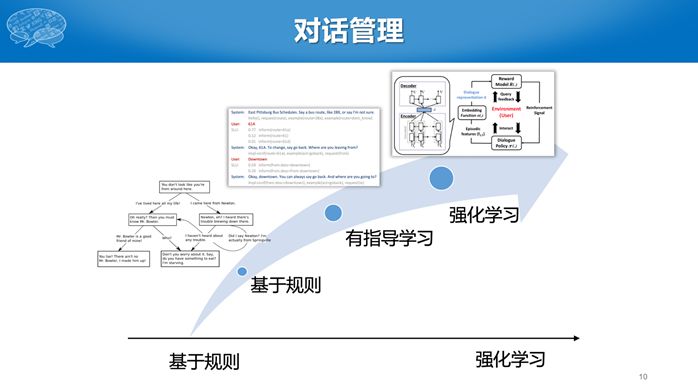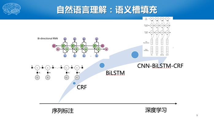 下面介绍这几个模块的技术发展趋势。其中,意图分类可以看成是文本分类,而且是短文本分类问题。早期采用SVM等线性分类器,最近主要采用深度学习方法,比如CNN或者CNN-LSTM。有人说深度学习需要大数据,对话领域数据不多,为什么还采用深度学习技术呢?这主要归功于预训练模型,使得深度学习在只有较少数据的情况下,仍然可以取得比较好的效果。