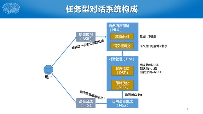 第三部分为自然语言生成。在对话系统里面语言生成工作相对比较简单,通过写模板即可实现。比如要询问出发地,就直接问“请问你从哪里出发”,然后经过 TTS 系统给用户反馈。整个过程可以一直循环下去,随着每次提问的不同,对话状态也随之变化,然后采用不一样的回复策略。