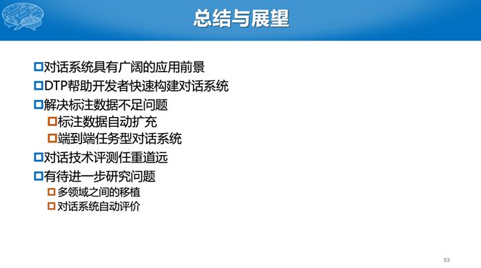 最后做一个总结:我们首先介绍了什么是任务型对话系统以及常用的技术方案;接着介绍了我们构建的对话技术平台DTP,它能够帮助开发者,快速构建任务型对话系统;然后介绍了我们近期的两个工作,主要为了解决对话系统中数据不足的问题。第一是帮助用户自动扩充数据,第二是不用标数据,直接端到端的构建任务型对话系统;最后介绍了我们组织的SMP人机对话评测,目前该评测仍需要人来参与,挑战比较大。未来我们主要关注于多领域之间的快速移植,以及对话系统的自动评价。谢谢大家!