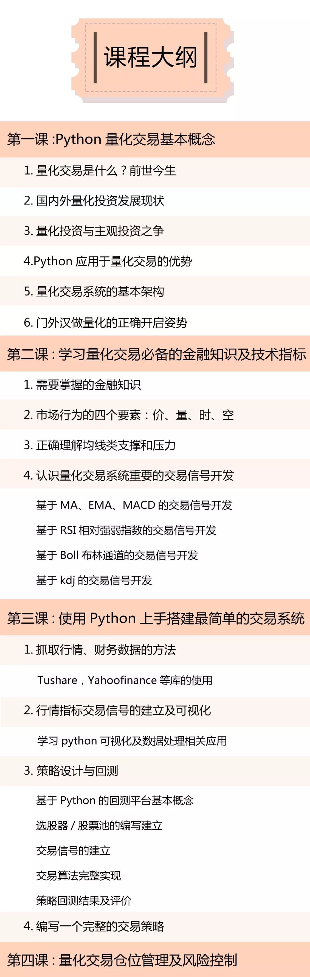 一站式入门Python量化交易,驾驭主观思维、量化思维,掌握量化交易必备金融知识。了解人工智能量化交易的本质,掌握量化策略完整的研发流程,搭建属于自己的量化交易系统,研发自己的量化策略,实现量化策略中的仓位管理和风险控制。学习AI在量化交易系统中的应用和实践。另外,本课程还会传授量化部门面试求职技巧,帮助求职者拿到理想工作offer。
