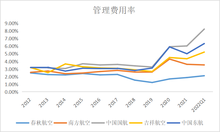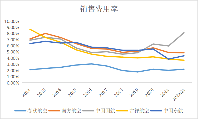近十年来,得益于电商直销的机票销售渠道,春秋航空的销售费用率均大幅低于同业。2022年一季度,南航、国航、东航的销售费用率分别为4.87%、8.11%、4.37%,春秋航空的仅为2.22%。