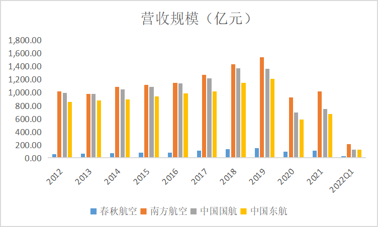 一方面在于较低的每客公里收益,另一方面春秋航空的机队规模相对较小,因此其收入规模远低于以国航、南航为代表的大航司。2021年全年,南航、国航、东航的营收分别为1016.44亿元、745.32亿元、671.27亿元,而春秋航空营收仅为108.58亿元,不及南航的九分之一,不及国航、东航的六分之一。