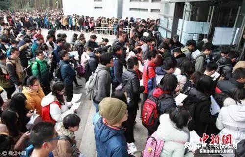 资料图:2016年2月15日,山西太原,春节后首场高校毕业生招聘会开场,图为众多求职者被一家公司的高薪待遇吸引。韦亮 摄
