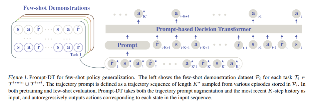 人们可以利用以前的经验,并从少量的演示中学习新的任务。与旨在通过更好的算法设计实现快速适应的离线元强化学习相比,我们研究了架构诱导偏差对少样本学习能力的影响。我们提出了一种基于提示的决策Transformer (Prompt- DT),它利用了Transformer体系结构和提示框架的顺序建模能力,实现离线RL中的少样本适应。我们设计了轨迹提示,其中包含了几个样本的演示片段,并编码了特定任务的信息来指导策略的生成。我们在5个MuJoCo控制基准测试中的实验表明,Prompt-DT是一个强大的少样本学习器,无需对看不见的目标任务进行任何额外的微调。Prompt-D比它的变体和强元离线RL基线有很大的优势,它的轨迹提示只包含几个时间步。Prompt-D对于提示长度的更改也很稳健,并且可以泛化到分布外(OOD)环境。项目页面:https://mxu34.github.io/PromptDT/。