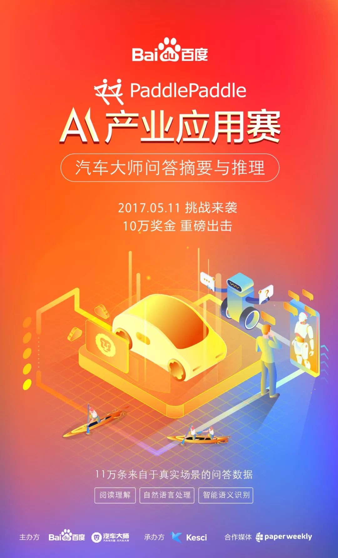 为了让模型训练准确有效,汽车大师在本次PaddlePaddle AI 大赛中首次对外公布了11万条来源于平台历史问答场景的文本数据集,每条数据都包含一次问答服务的完整过程——问题描述、追问追答、结构化问诊小结。科赛的在线数据工作平台K-Lab和百度为本次赛事提供全程支持,数据集可直接挂载于K-lab,并利用百度PaddlePaddle深度计算框架和百度云计算资源进行在线模型训练。本次赛事的支持媒体平台PaperWeekly是专业推荐、解读、讨论和报道人工智能前沿论文成果的学术平台,致力于让国内外优秀科研工作得到更为广泛的传播和认可,并拥有着大量AI科研人员作为忠实读者。