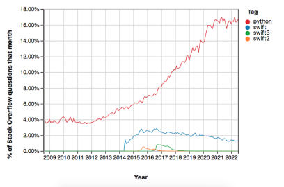 图:Stack Overflow 中有关 Swift 与 Python 的问题数量