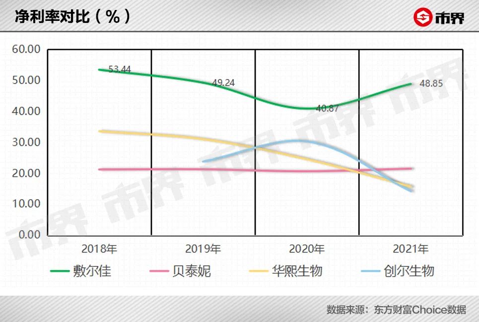 其实敷尔佳的毛利率水平,基本和业内可比企业持平,比如近几年贝泰妮的毛利率也维持在76%—82%之间。不过,敷尔佳的净利率,远高于同行,甚至直追茅台。