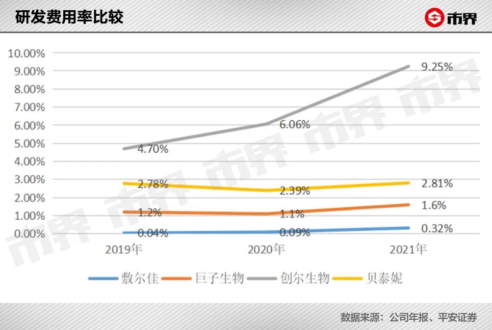 敷尔佳的研发能力一直备受质疑。2021年,其研发人员仅有6名,研发投入524.3万元,虽然较2019年的60.4万元有明显的增长,不过研发费用率还是远低于同行。