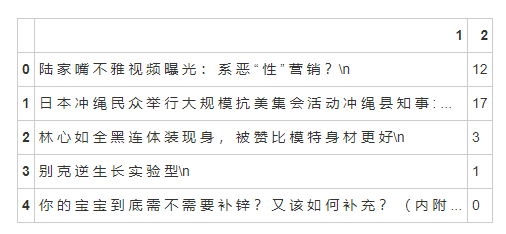 le = preprocessing.LabelEncoder()le.fit(np.unique(train_df[0].tolist()))print('标签值标准化:%s' % le.transform(["world", "entertainment", "car", "baby","entertainment"]))print('标准化标签值反转:%s' % le.inverse_transform([0, 2 ,0 ,1 ,2]))