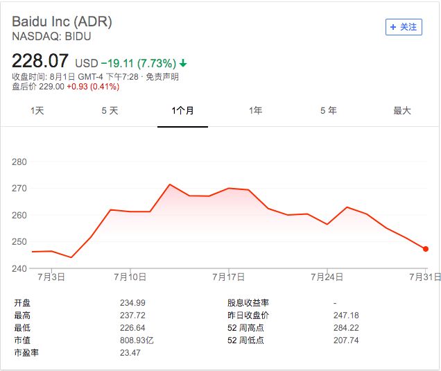 另外,近一个月来,百度的股价走势也并没有被财报消息提振,是这样的姿态: