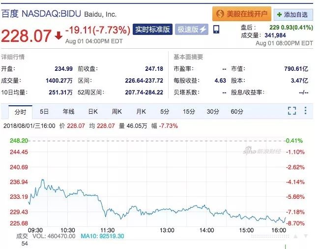 谷歌预计推出中国版搜索安卓App的消息传出,百度股价第一个慌了:盘前股价下跌19.37美元,跌至 227.81 美元,跌幅达7.84%。截止8 月1日,百度收盘价为 228.07美元,市值跌破800亿美元。