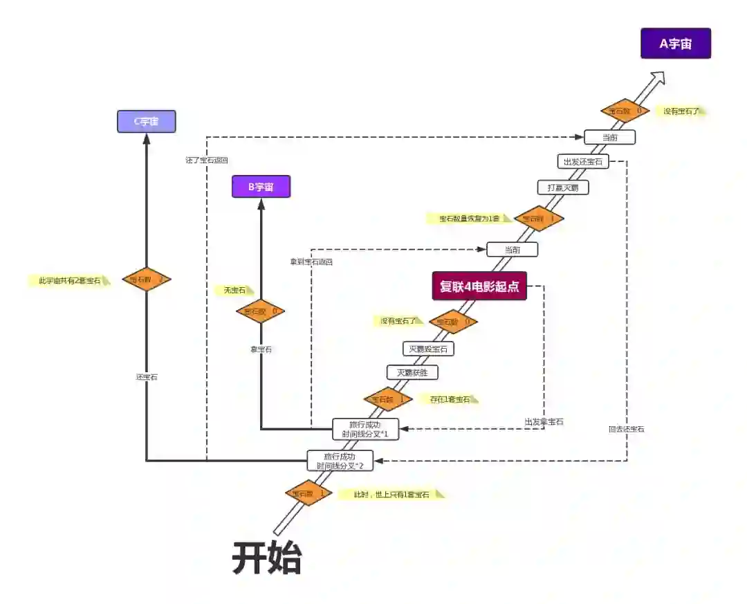 因为回到过去会开启新的时间线,所以世界A里复联的时间旅行创造出了世界B,并从B借走了宝石,带着宝石回到世界A。