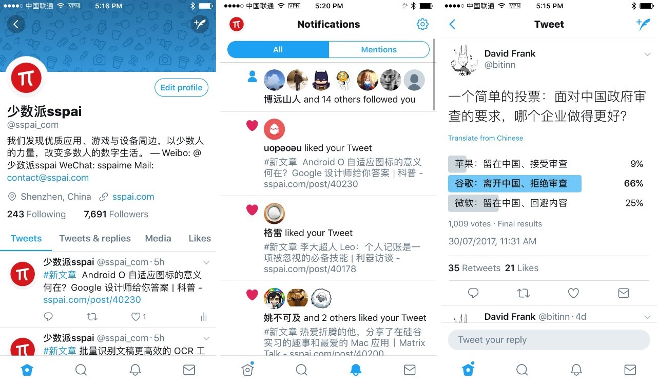 Twitter 成立了有十多年了,是老牌社交媒体。Twitter 原意为鸟的吱喳啾鸣声,引申指碎碎念念的话。目前国内最知名的模仿者是新浪微博(17 年 2 月,新浪微博这个模仿者的市值已经超过了它的模仿对象了),微博做了很多本地化的工作,在国内很受欢迎,但是随着国内「倒车」进程的进行,甚至大有调头狂奔的趋势,微博这个国内平台变得越来越不可靠,无论微博是否在你的舒适区内,完全转向 Twitter,或者两者同时使用都变得越来越有意义。