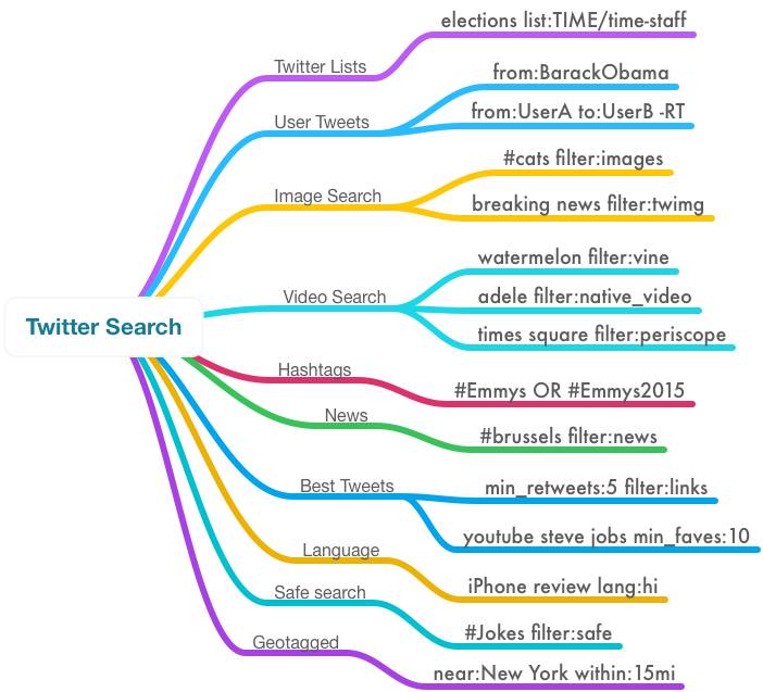 Twitter 有一套搜索语法,可以让搜索结果更加精确。比如使用 from: 可以指定被搜索的用户,只搜索他的推文,例:from:@realDonaldTrump 只搜索 Trump 的 Tweets。