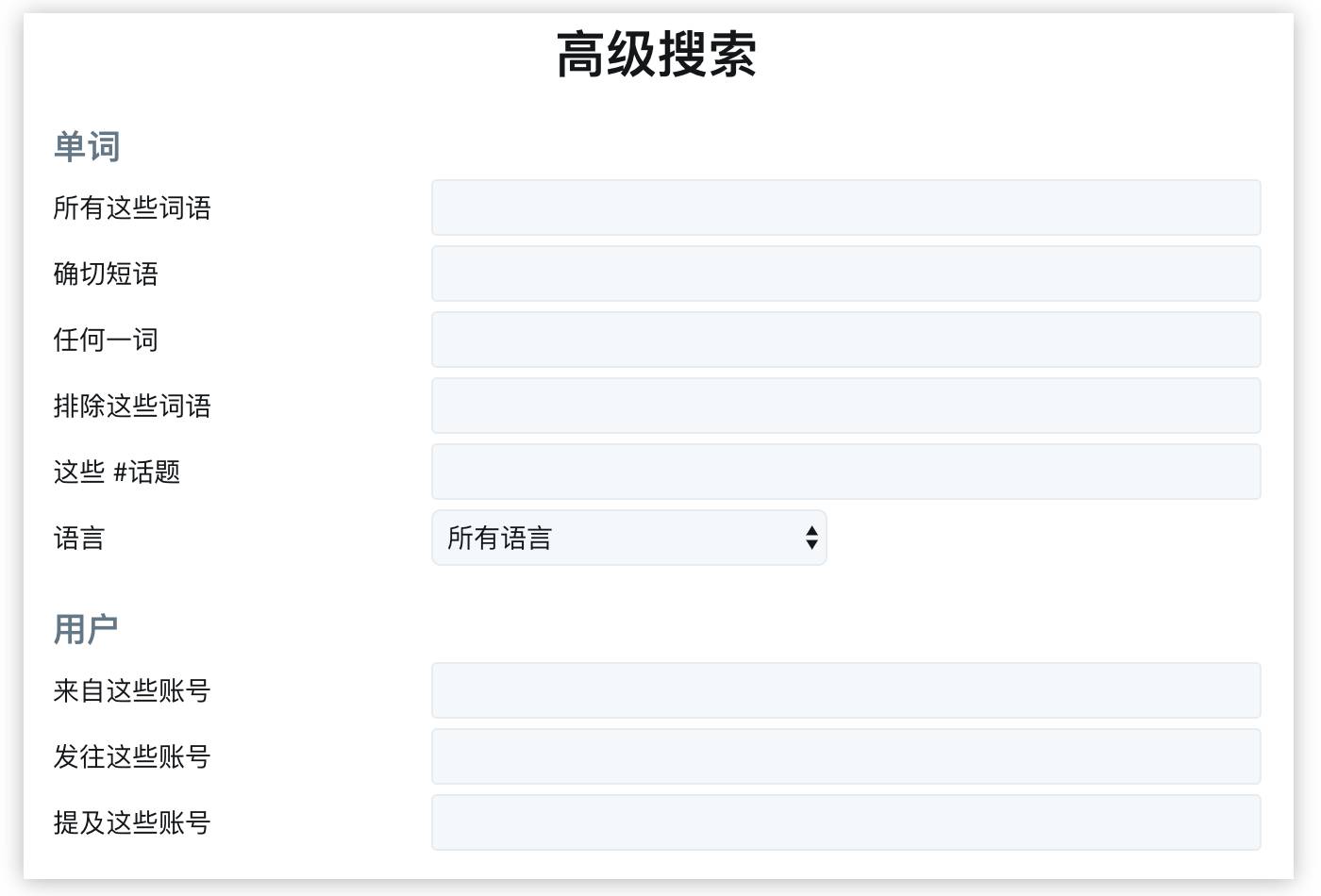 如果你不喜欢使用语法,Twitter 有一个高级搜索界面,可以让你自己选择要搜索的项,去精确你的搜索结果: