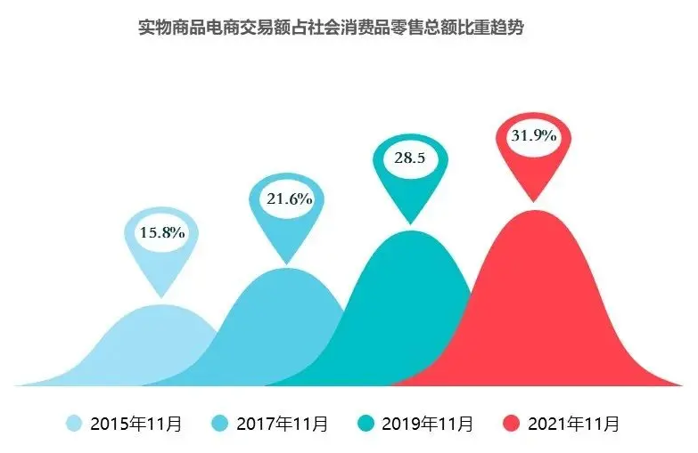 首先,作为互联网超级大赛道,电商有着稳定但不慢的增长速度。近年来,中国的电商渗透率(实物商品电商交易额/社会零售总额)更是大幅上升。到2021年11月,该比重已经高达 31.9%,而且仍在持续上升中。