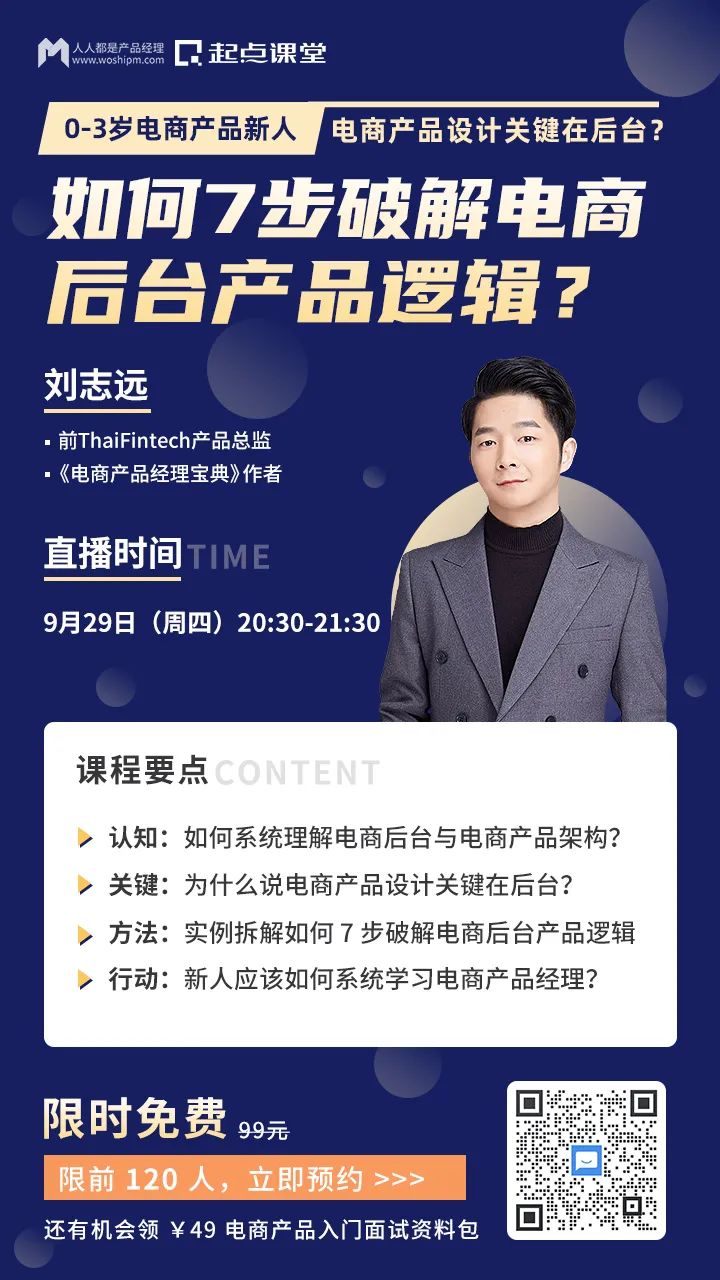 针对这些问题,为了帮助 0-3 岁电商产品新人更快入门与成长,9月29日(周四)晚8点半,人人都是产品经理&起点课堂特邀前Thaifintech产品总监、畅销书《电商产品经理宝典》作者@刘志远,准备了这次直播公开课。