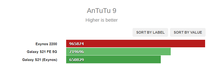 在安兔兔 9.0 中,该设备的得分高达 965874 分,与去年的 Exynos 2100 相比,提升了 46%。最后是 GFXBench Aztec Ruins(Normal)基准测试,Exynos 2200 芯片组取得了 109 fps 的帧率。遗憾的是,与搭载骁龙 8 Gen 1 的小米 12 相比(143 fps),Exynos 2200 的差距还是有些明显、甚至低于去年的骁龙 888 平台。