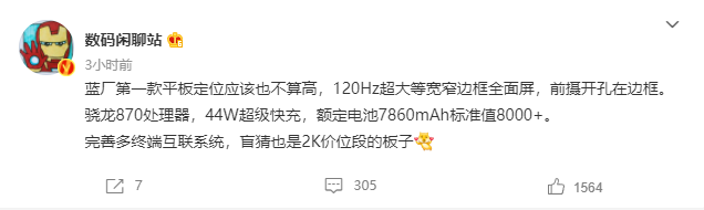 据 @数码闲聊站 今日爆料,vivo 首款平板定位应该不算高,猜测在 2000 元价位段。这款平板将配备 120Hz 超大等宽窄边框全面屏,前摄开孔在边框,搭载骁龙 870 处理器,内置 7860mAh 容量电池,支持 44W 快充,拥有多终端互联系统。该平板将和小米平板 5、荣耀平板 V7、联想小新 Pad Pro 等一起竞争。