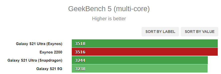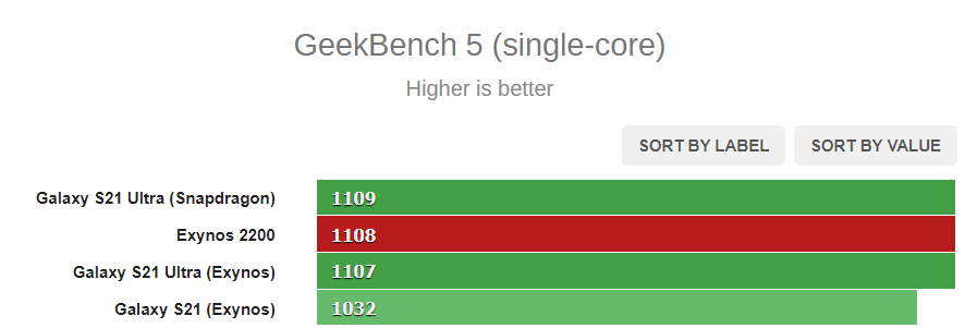 随着三星正式发布 Exynos 2200 旗舰芯片组,MySmartPrice 也在第一时间分享了该 SoC 的首份基准测试成绩。报道称测试平台为即将发布的 Galaxy S22 Ultra 旗舰智能手机,在 Geekbench 5 中,该设备的单核成绩为 1108,多核成绩为 3516,与 Exynos 2100 几乎相同,显然三星将更多精力放在了 GPU 图形性能的提升上,而不是 CPU 部分。