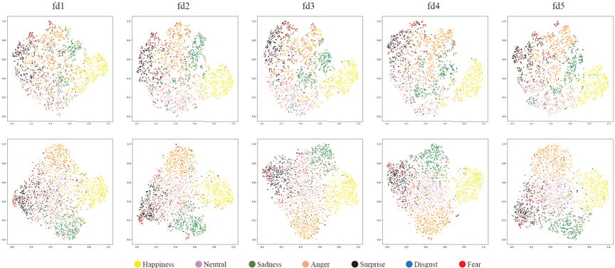 图2 网络学习到的人脸特征分布。相比基准网络(第一行), Former-DFER(第二行)能够学习到更具有判别性的人脸特征。