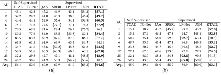 本文提出的方法可有效缓解AU识别模型在训练时对标签的依赖,从图3中的表可见,在加入了本文提出的区域补全和光流估计后,相比原始骨干网络和其他CV中常用的自监督任务,能更显著地提升识别性能。在BP4D和DISFA两个基准数据集上,RTATL均取得了SOTA性能,如图4所示。