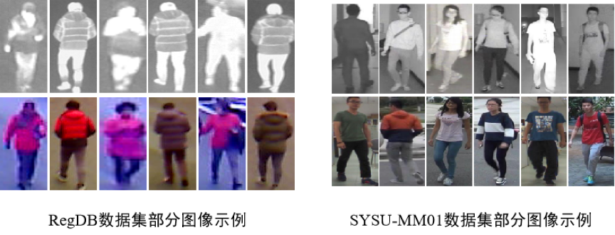 为了验证本文所提方法的有效性,这里可视化了所生成的中间模态图像,如图3所示,图中四行从上到下分别表示原始可见光图像、原始近红外图像、由可见光图像所生成的中间模态图像与由近红外图像所生成的中间模态图像。可以看到,所生成的中间模态图像的模态差异得到了有效的降低,因此也表明了本文所提方法的有效性。