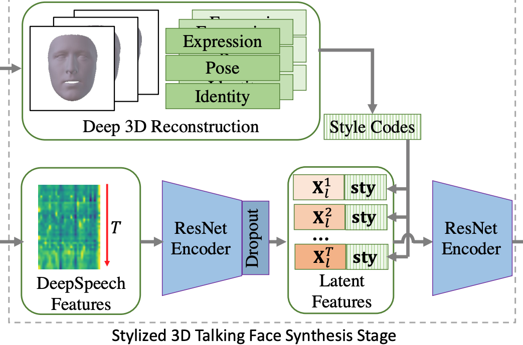 说话人合成任务旨在根据输入的音频以及目标人物的脸像,合成形象的面部动作与逼真的视频。该任务主要存在两个困难: (1) 如何建模多风格的、形象的音频到面部动作映射。(2) 如何根据目标人物的图像渲染出逼真的视频。为了解决这两个问题,我们 (1) 定义了连续的风格空间编码,根据该编码合成音频同步的说话动作。(2) 实现了one-shot deferred neural render,给定单张人脸,不用任何fine-tune,即可控制该人脸的3D表情、姿态,并且渲染为真实2D图像。下面我们分别介绍这两部分的实现。
