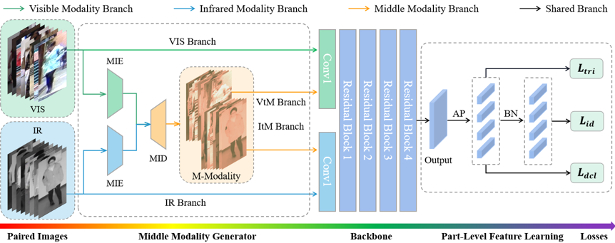 给定一个需要检索的行人和来自于不同模态的行人数据库,可见光-红外跨模态行人重识别的目的是从数据库中检索出该行人在不同模态下和不同摄像机下的该行人图像。跨模态行人重识别技术由于在安防领域中的重要作用,已成为学术界和行业界最受欢迎的研究方向之一。通常来讲,现有的跨模态行人重识别方法设计网络模型将可见光和红外图像映射到一个公共的嵌入空间中,这样,跨模态检索任务就可以归结为在我们所熟悉的欧式空间中的行人重识别检索任务。然而,由于可见光和红外图像之间的模态差异是高度非线性的,因此为跨模态行人重识别构建一个公共的特征空间是一个非常有挑战性的问题。本文从以下两个方面着手解决这个问题:(a):本文引入了一个非线性网络来缓解可见光和红外模态图像的非线性关系;(b):本文将可见光和红外图像转换成一个统一的中间模态图像空间,以减少它们之间的模态差异。