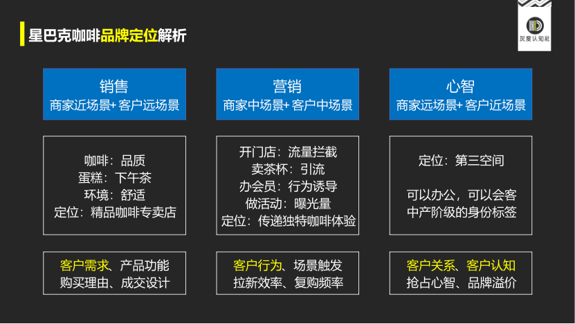 最后,就是有些人在家里,还没出门,就已经决定了要进哪个咖啡店。他们是怎么决策的呢?是对某个品牌产生了强记忆、强偏好、强唤醒。一想到某些关键词,就能联想到某个品牌。这叫心智定位。