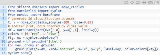 make_circles()函数会产生一个二分类问题,这个问题会出现在一个同心圆中。