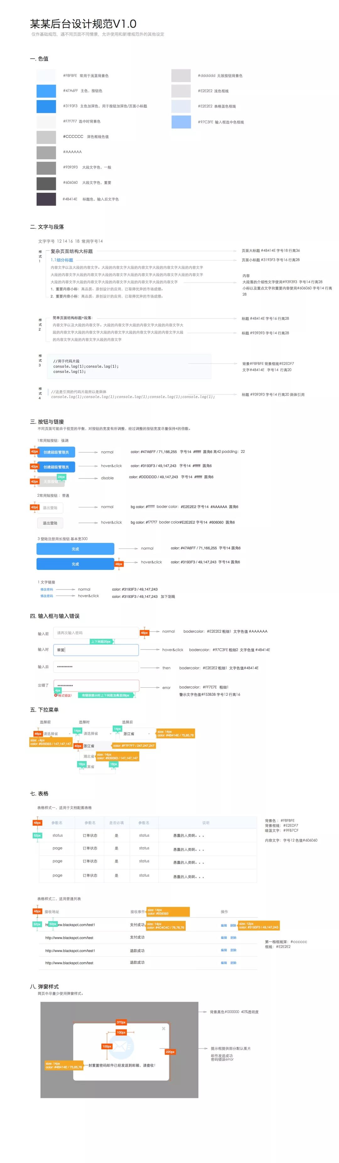 通过上面的工作,我们接下来使用sketch或蓝湖等工具,将文档规范输出。注意前面说的,UI规范文档是一个持续动态的文档,保证团队可以及时更新和复用。下面是一个例子