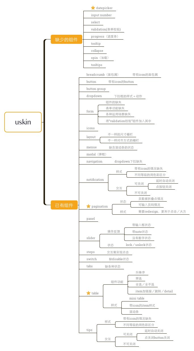 对组件进行分类,注意的是有一些组件可能会出现个性化的情况。根据产品经理需求而定。对照新版本和需求,对现在没有的组件也进行标注,以下面的方式进行展开