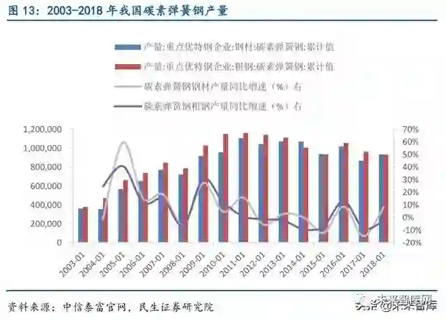 对弹簧钢性能要求越来越高,国内高端弹簧钢存在进口替代空间。社会中绝大部分重要行业都与弹簧业相关,所以弹簧的产品性能必须满足社会经济发展的需要。然而随着我国高 端制造的发展,对弹簧的性能提出了越来越高的要求,所以对弹簧钢的强度、重量、韧性、 耐腐蚀性及耐用性等性能的要求越来越高。然而,目前中国弹簧钢在纯净度、抗疲劳性、表 面质量以及质量稳定性等方面与国外存在较大差距,无法满足高档乘用车、铁路及重载货车 的使用要求。所以,目前我国中低端弹簧钢产品过剩,而高档次及深加工弹簧钢具有较大进 口替代空间。