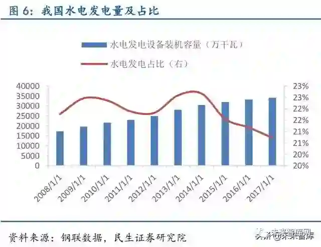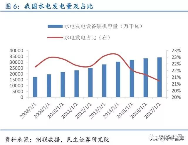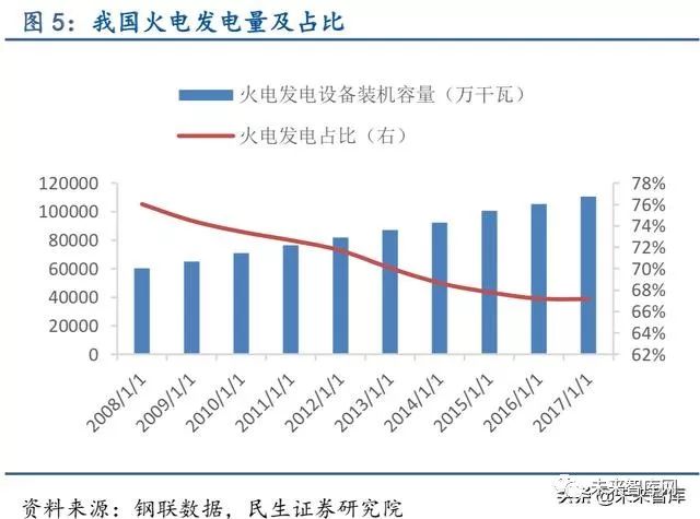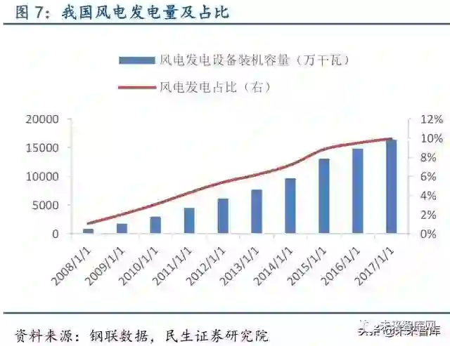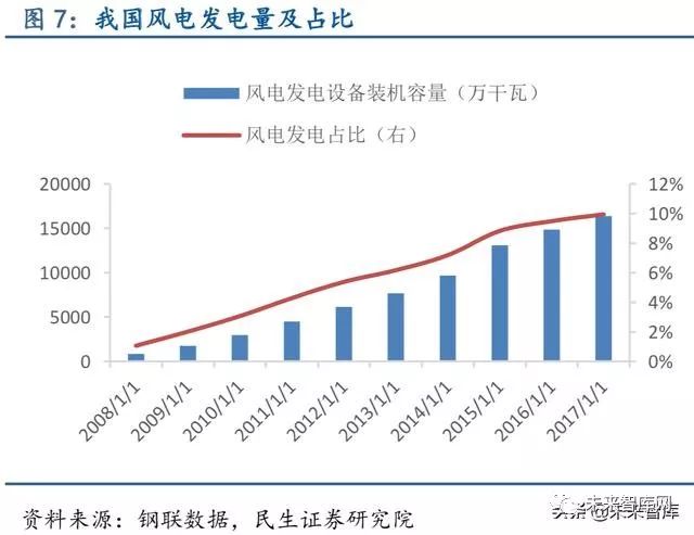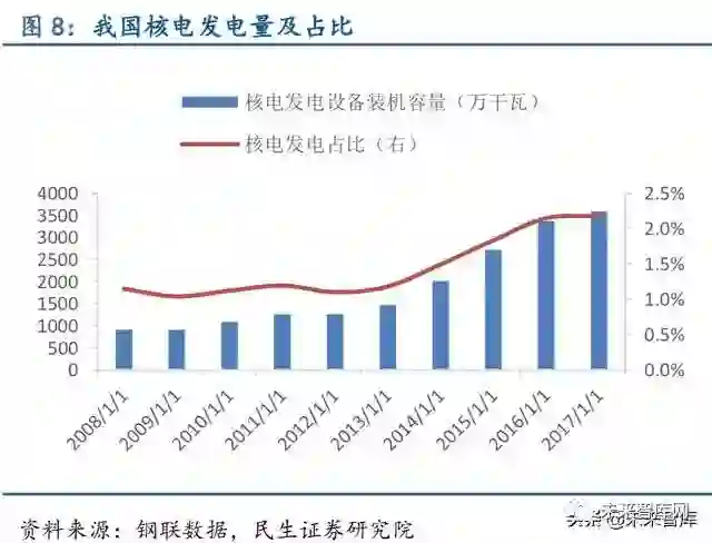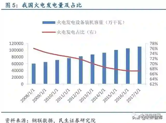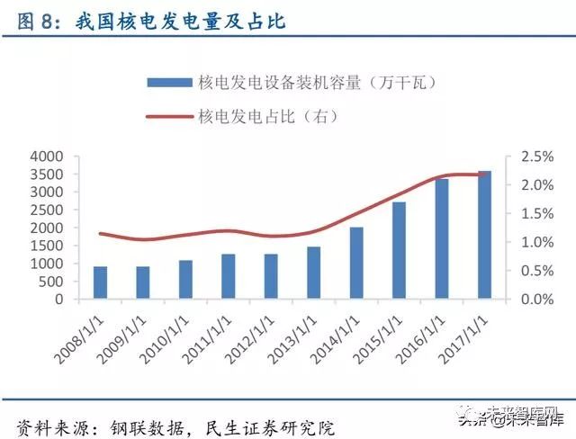 清洁能源发电占比持续提高,非化石能源发电对特钢需求逐渐释放。我国能源长期以煤炭等石化能源为主,火电是我国的主要能源形式,清洁新型能源占比较低,能源结构并不合 理。随着我国经济增速放缓,能源消费增速下滑,目前是进行能源结构转型升级最佳时机。 “十二五”及“十三五”期间,我国火电发电占比由73%下降至67%,风电、核电发电占比 均显著增长,分别由4%增长至10%、由1.19%增长至2.18%,能源结构转型已经取得积极成 效。根据我国《能源发展“十三五”规划》预期目标来看,清洁能源消费比重有望在“十三 五”期间持续提高。近两年核电核准开工数不及预期,截至2017 年9 月30 日,我国已投运 核电机组37 台,装机容量3581 万千瓦,在建2200.4 万千瓦。根据国家能源局规划,到2020 年我国核电运行和在建装机将达到8800 万千瓦,但2017 年原定新核准8 台目前并没有新核 准或新开工机组,我国未来两年核电将投产约3000 万千瓦。基于AP1000 的自主化“华龙一 号”计算得到的三代核电机组单位投资约为1.4 万元/千瓦,预计2020 年前我国核电投资将 达4000 亿元左右,清洁能源应用的持续提升有助相应特钢的需求释放。