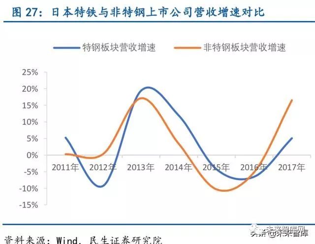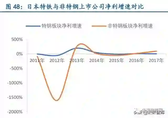 日本特钢上市公司盈利表现更加稳定,较非特钢公司周期性弱。大同特殊钢、日本高周 波钢业、日本冶金工业、山阳特殊制钢、爱知制钢、日立金属、日本金属、三菱制钢与东碧 工业是日本九大特钢生产公司,我们将其作为上市特钢板块,与东证交易所其他上市钢铁公 司进行对比,可以发现日本特钢上市公司营收增速与非特钢公司基本一致,但净利增速却表现十分稳定,表明特钢公司具有良好的抗周期属性,产品存在价格粘性,能够有限抵御经济 下行周期。