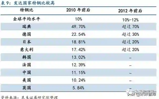 发达国家特钢比多在20%以上,瑞典最高可达到70%以上。通过对比2010 年前后世界主 要钢铁生产国家特钢比,可以发现全球平均特钢比为10%,其中瑞典特钢比50%,世界第一, 德过、日本、意大利等发达国家特钢比分别为23%、19%、17%,均高于全球平均水平。2012年前后,瑞典特钢比上升至70%以上,德国上升至30%以上,日本、意大利则均上升至20% 以上,全球特钢比也略有窄幅上升。