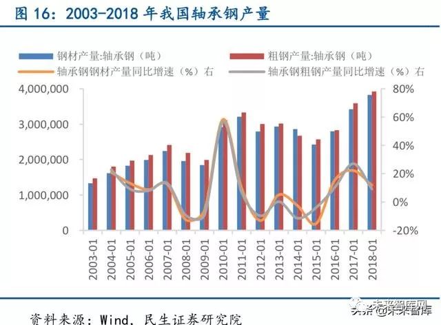 轴承钢下游市场规模突破千亿,国产轴承钢连续8 年产销量世界第一。轴承作为机械设 备重要的零部件,具有不可替代的重要作用,近年轴承行业与机械制造业一同快速发展,2018 年轴承行业规模已经突破千亿美元,预计未来仍将保持较高速增长。我国轴承钢产量在2010 年增速达到顶峰,随后快速回落至负增长,近年轴承钢产量开始回暖,轴承钢产量不断创造 新高,钢材产量从2003 年的133 万吨增长至2018 年的382 万吨,粗钢产量从2003 年的147 万吨增长至2018 年的392 万吨。根据特钢协36 家企业的统计数据,2017 年兴澄特钢、新冶 钢和本钢特钢分别位居轴承钢产量前三位,占国内轴承钢总产量的51%。其中,兴澄特钢去 年生产轴承钢96.5 万吨,有63 万吨都供应给瑞典SKF、德国SCHAEFFLER、日本NSK、NTN 等世界知名轴承企业,兴澄特钢的轴承钢已连续8 年位列世界轴承钢产销量第一。